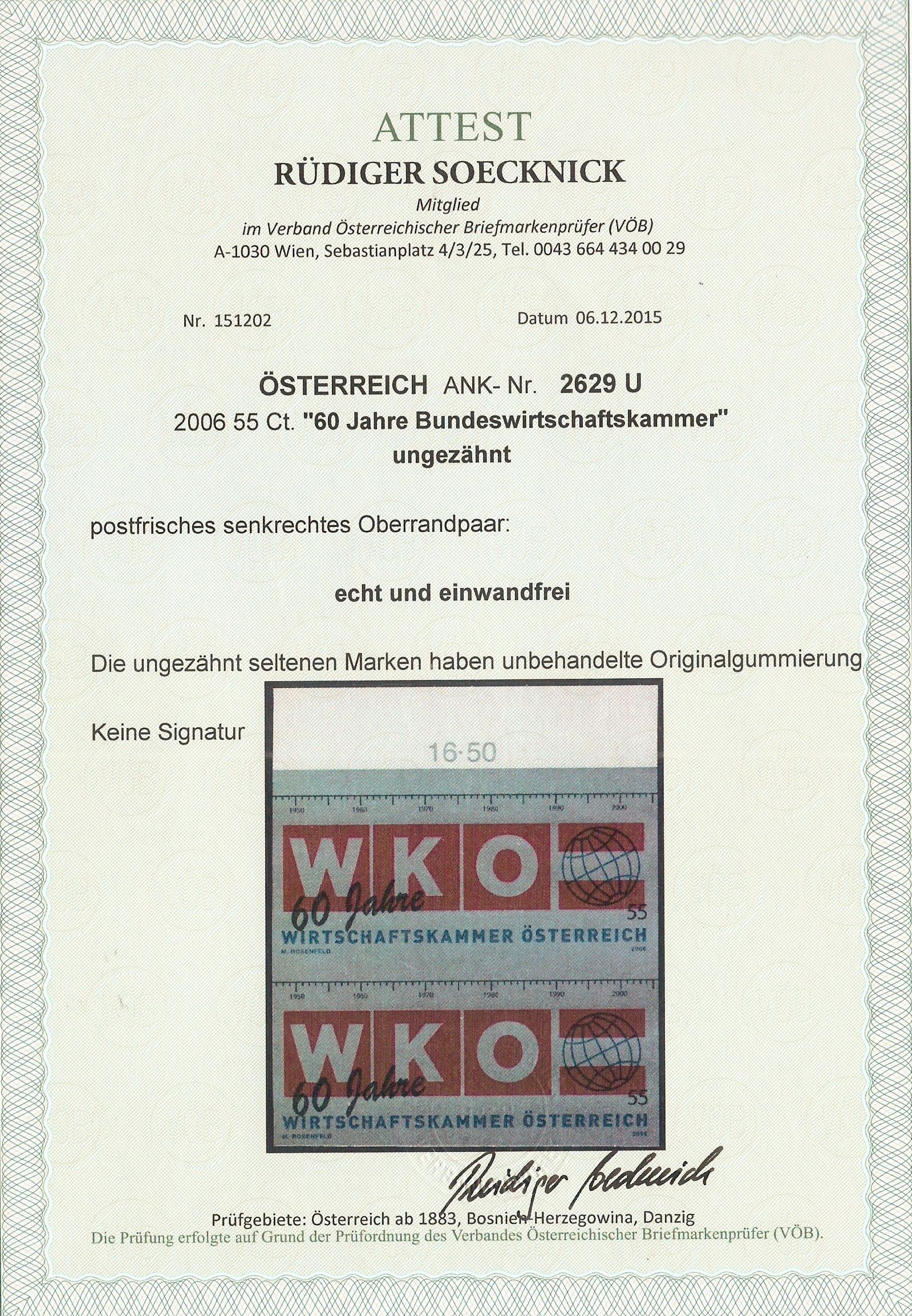 2006 - 60 Jahre Bundeswirtschaftskammer - ANK 2629 U - UNGEZÄHNT - senkrechtes Oberrandpaar - Fotoattest Soecknick - Postfrisch ** / DB / Kommissionsverkauf "HF"