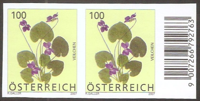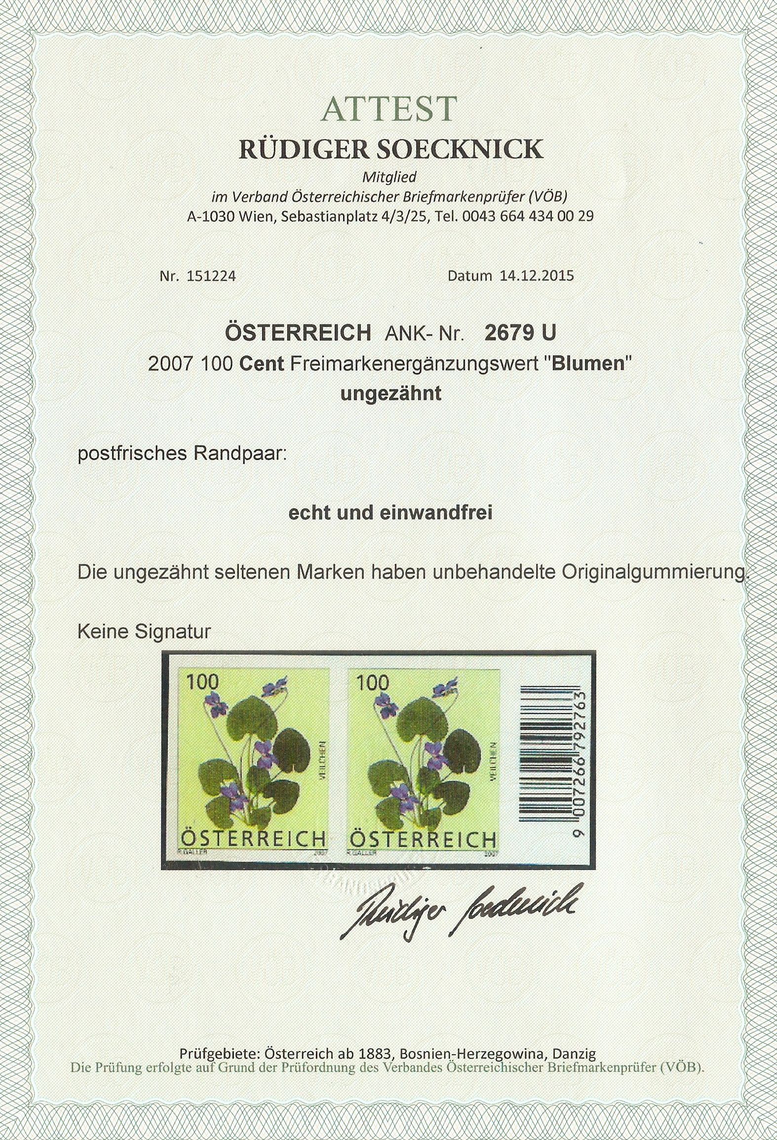 2007 - Österreich - BLUMEN - VEILCHEN - ANK 2679 U - Ungezähnt - waagrechter rechter Bogenrand mit Strichcode - Fototattest - Postfrisch ** / DB / Kommissionsverkauf "HF"