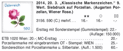2014 - Sondermarke - Porzellanmarke - Augarten - Wiener Rose - ANK 3156 - Postfrisch ** / DB / Kommissionsverkauf "FH"