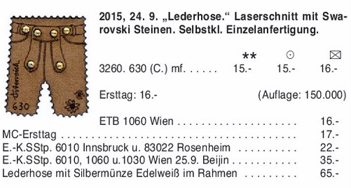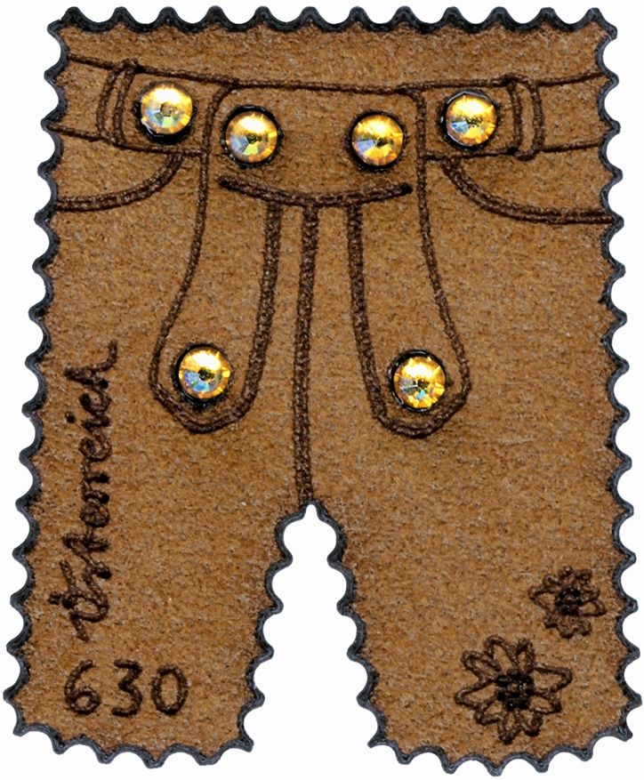 Im Jahr 2004 erschienen zum ersten Mal Sondermarken mit Kristallen von Swarovski, die als Weltneuheit in den Swarovski Kristallwelten präsentiert wurden. Die Zusammenarbeit mit der international renommierten Firma Swarovski, die im Tiroler Ort Wattens seit mehr als 120 Jahren hochwertigste Kristalle produziert, findet mit dieser unkonventionellen Ausgabe eine Fortsetzung: Swarovski Kristalle zieren eine aus Alcantara-Leder gestanzte Sondermarke in Form einer alpenländischen Lederhose.