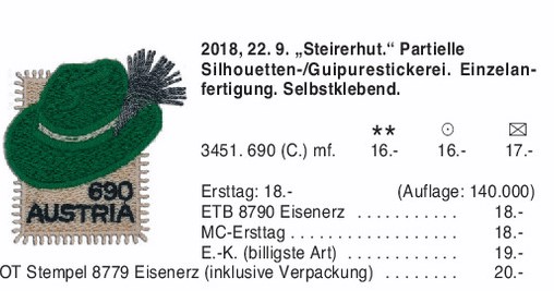 Sondermarke - ANK 3451 - Steirerhut - Stickereibriefmarke - Postfrisch **