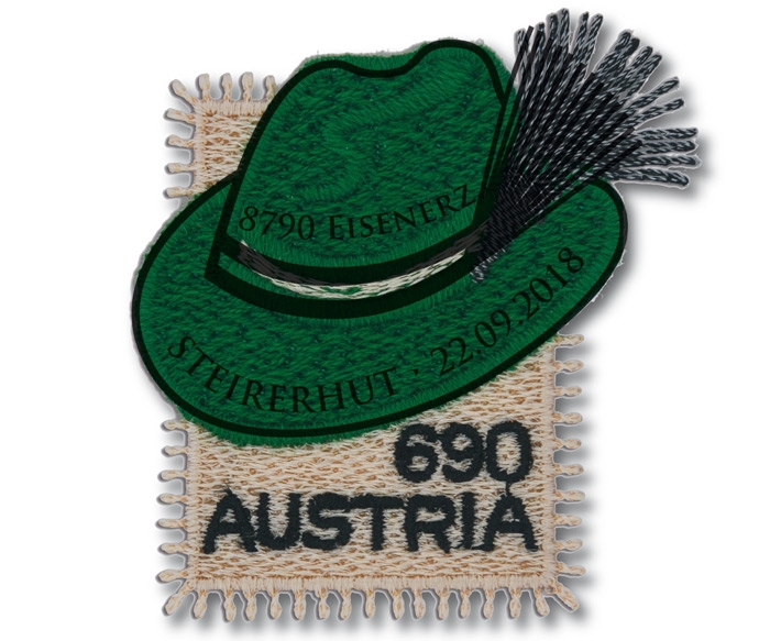 Aus Wien stammen bereits fantastische Briefmarken aus Porzellan, Glas, echtem Leder, sogar eine Dirndl-Briefmarke gibt es – und dieses Jahr eine weitere Weltneuheit: den Steirerhut – jene traditionelle Kopfbedeckung, die sich wieder zunehmender Beliebtheit erfreut und jetzt als kursgültige Briefmarke erscheint – originalgetreu auf naturfarbenen Hintergrund mit Zähnung in Guipure-Stickerei. Gefertigt wurde dieses Kleinkunstwerk von der Vorarlberger Manufaktur Hämmerle & Vogel – ein Unternehmen, das bereits einige faszinierenden textile Briefmarken realisiert hat.