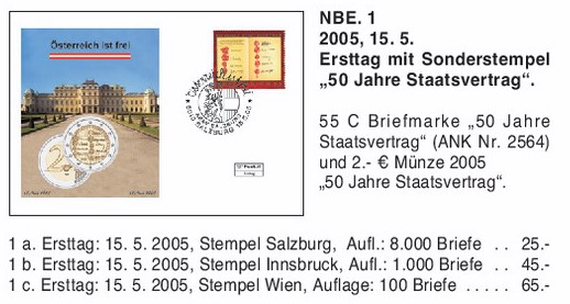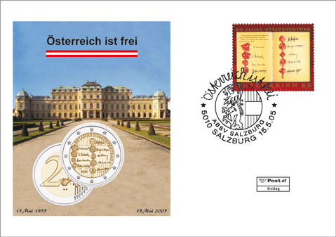 55 Cent Briefmarke "50 Jahre Staatsvertrag" (ANK Nr. 2564) und 2 Euro Münze 50 Jahre Staatsvertrag mit Sonderstempel "50 Jahre Staatsvertrag"