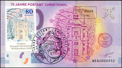Christkindlkombination Null Euro Schein mit Weihnachtsmarke