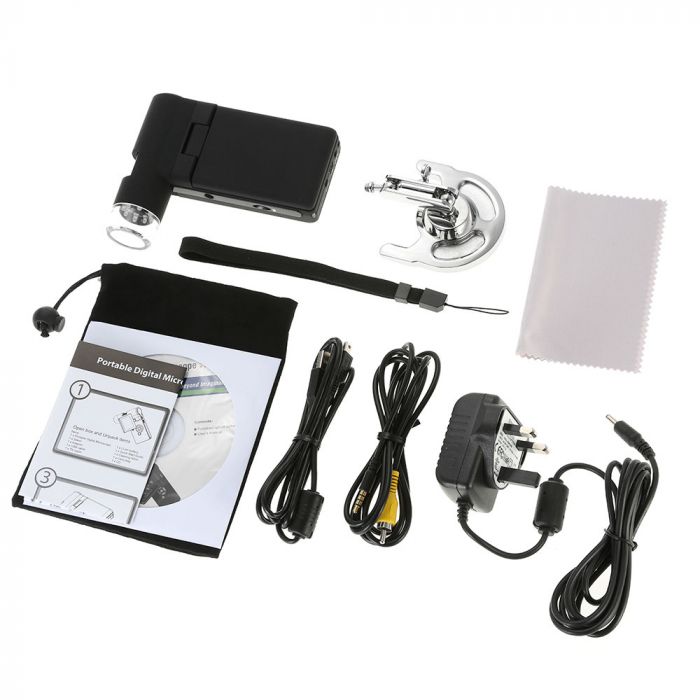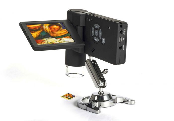 Dieses neue digitale Mikroskop ist eine bedeutende Weiterentwicklung bisher bekannter Mikroskope. Es kann dank der enthaltenen Lithium-Ionen-Batterie und der Mikro-SD-Speicherkarte unabhängig von einem stationären PC genutzt werden. Auf dem schwenkbaren 3 Zoll-Farbdisplay sind die Untersuchungsobjekte gestochen scharf abgebildet und lassen sich bis 200-fach vergrößern, wobei eine digitale Vergrößerung bis 500-fach möglich ist. Mit 8 dimmbaren LED`s.