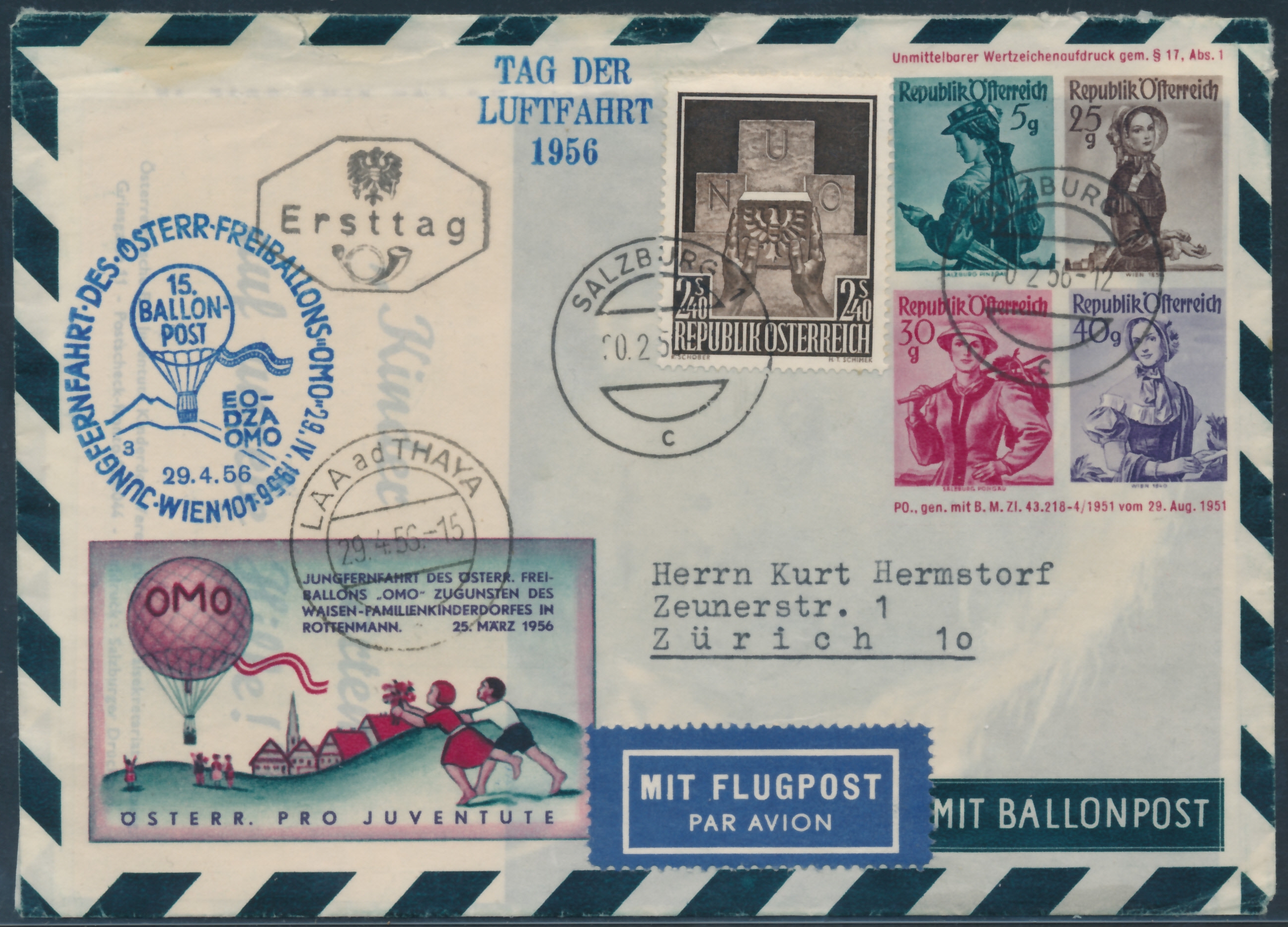 Österreich - 15. Ballonpost 29.04.1956 nach Zürich / Schweiz - Ersttag / FDC - Tag der Luftfahrt 1956 / DB / Kommissionsverkauf "BH"