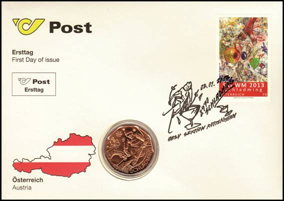 Mit 5 Euro Kupfer-Münze "Schladming 2013" und der Sondermarke "Steirisches Herz" (70 Cent)