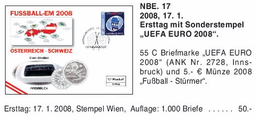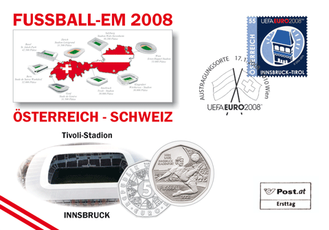 55 Cent Briefmarke "UEFA EURO 2008" (ANK Nr. 2728 Innsbruck) und 5 Euro Münze 2008 "Fußball - Stürmer" mit Sonderstempel "UEFA EURO 2008"