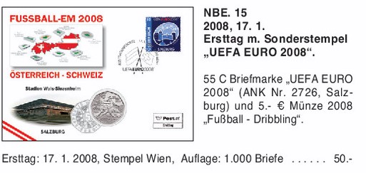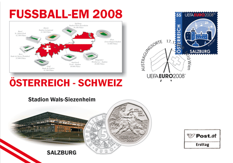 55 Cent Briefmarke "UEFA EURO 2008" (ANK Nr. 2726 Salzburg) und 5 Euro Münze 2008 "Fußball - Dribbling" mit Sonderstempel "UEFA EURO 2008"
